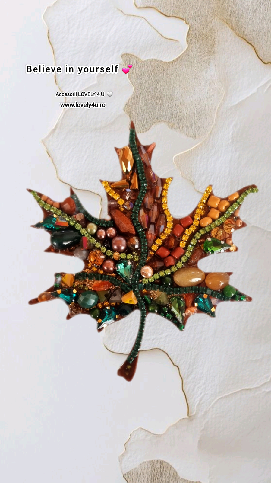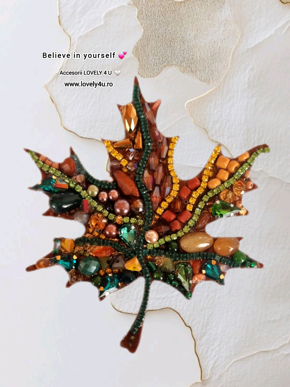 🍃 BROȘĂ HANDMADE „FRUNZA ELENORA” – MODEL UNICAT CU PIETRE SEMIPREȚIOASE ȘI MESAJ MOTIVAȚIONAL 🍃