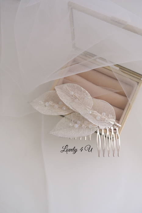 Materiale: Cristale cu reflexii, Frunzulițe metalice, Pieptan metalic argintiu, fir metalic placat cu argint 9