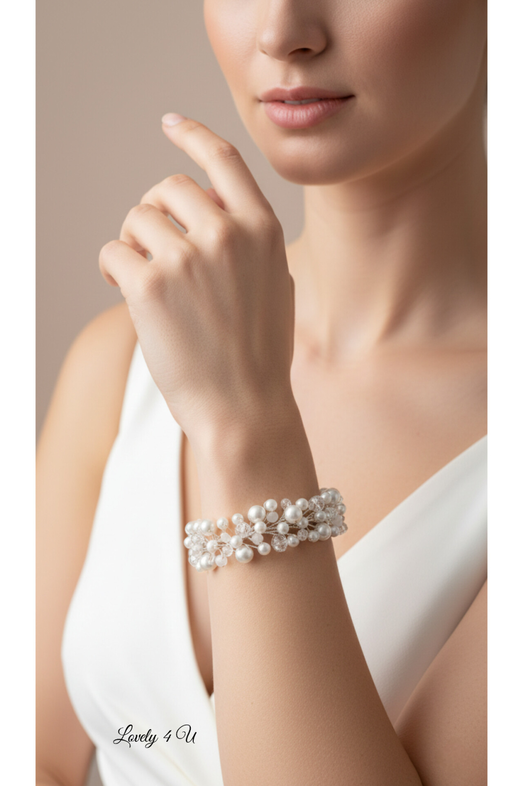 O brățara realizata manual din materiale de calitate superioara: perle albe, Cristale de sticla transparente cu reflexii si alb-opal , și fir metalic inoxidabil placat cu argint925 și finisaj permanent non-tarnish.