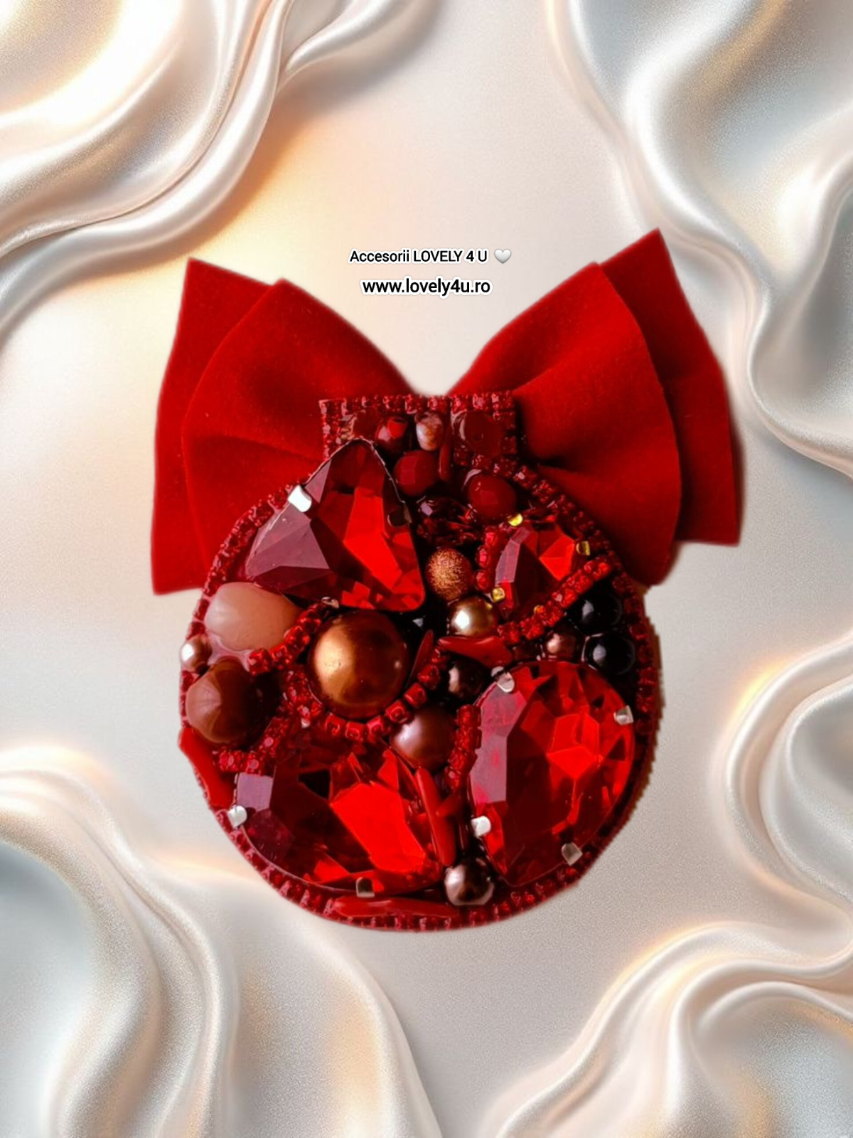 🌹 Materiale: cristale roșii, perle, pietre semiprețioase (coral, unakit, cameol), funda din catifea roșie, bază metalică argintie.