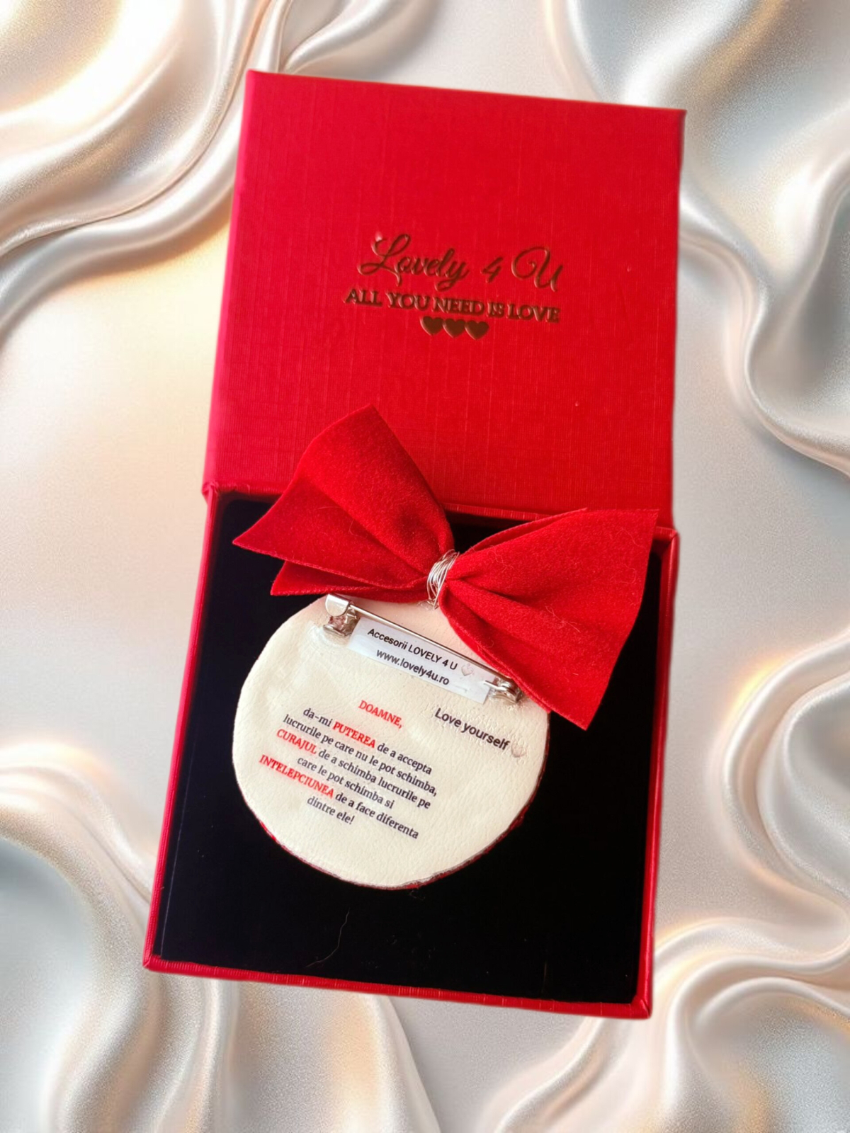 Cristalele roșii aduc pasiune și energie, perlele naturale simbolizează puritatea sufletului, iar pietrele coral, unakit și cameol poartă vibrația calmului și a vindecării emoționale. Funda din catifea roșie oferă un aer elegant și festiv, transformând această broșă într-un cadou cu semnificație – un simbol al iubirii și al echilibrului interior.
