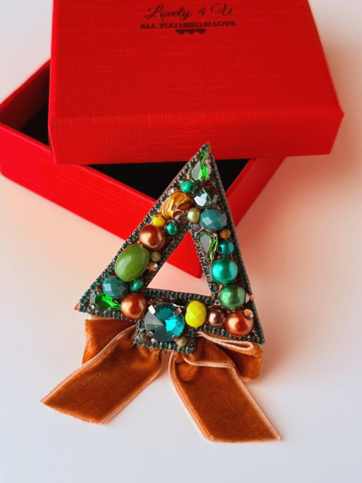 Broșa, cu o lungime de 7 cm, are forma unui brad de Crăciun reinterpretat cu delicatețe și eleganță. Baza este lucrată cu fir metalic placat cu aur, decorată cu o fundă fină din catifea maro si elemente decorative verde-olive și completată de cristale, perle și pietre semiprețioase care reflectă lumina într-un joc subtil și fermecător.