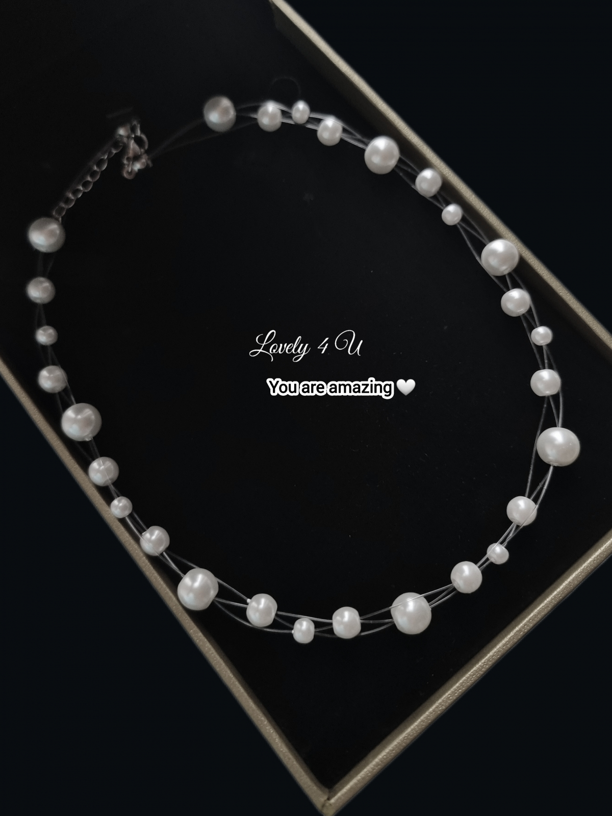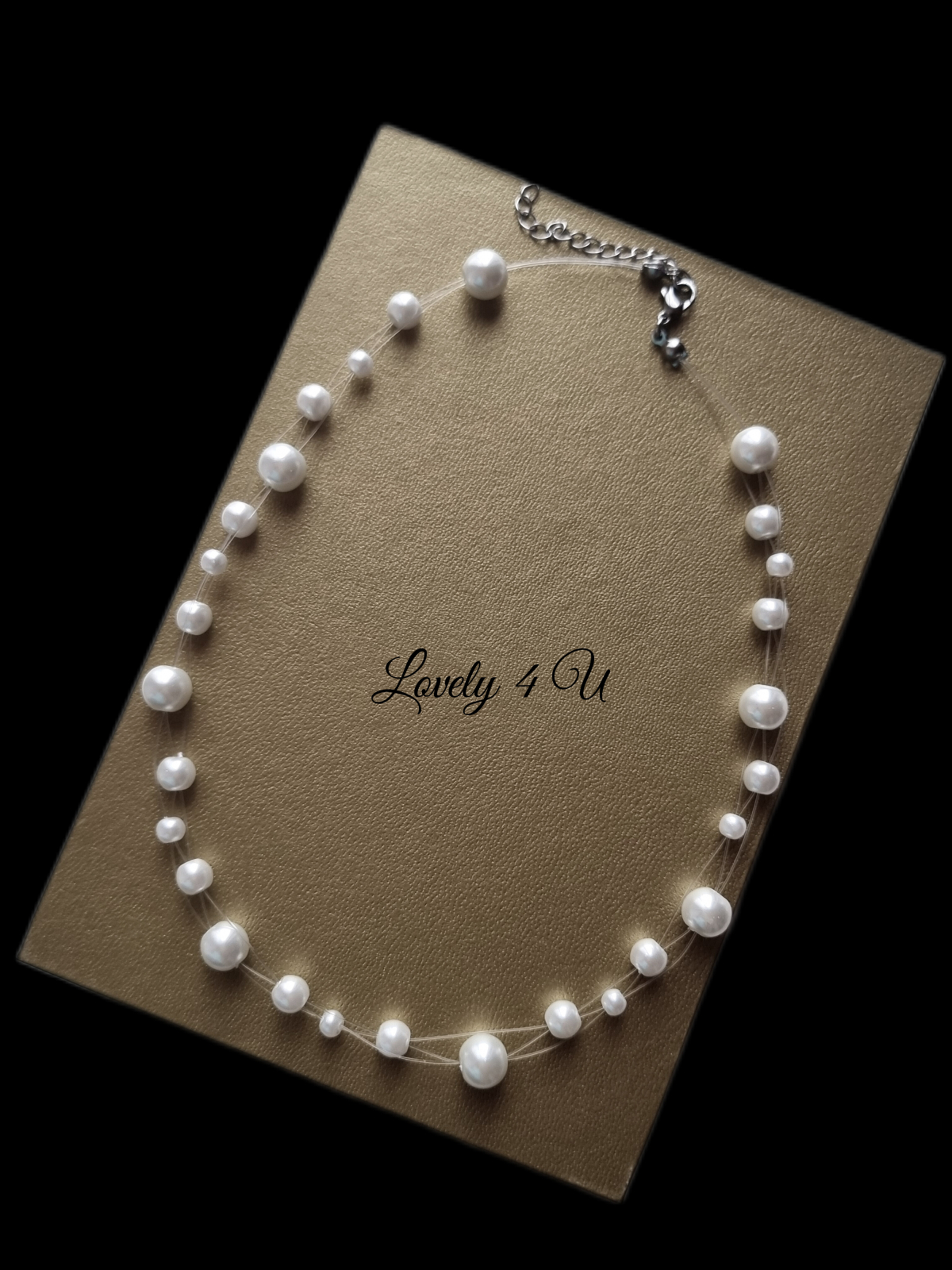 Colierul cu perle plutitoare este o bijuterie delicată, creată pentru femeia care iubește eleganța subtilă și frumusețea autentică. Firul transparent creează iluzia că perlele albe dansează pe piele, așezându-se delicat la baza gâtului și completând cu grație orice ținută.