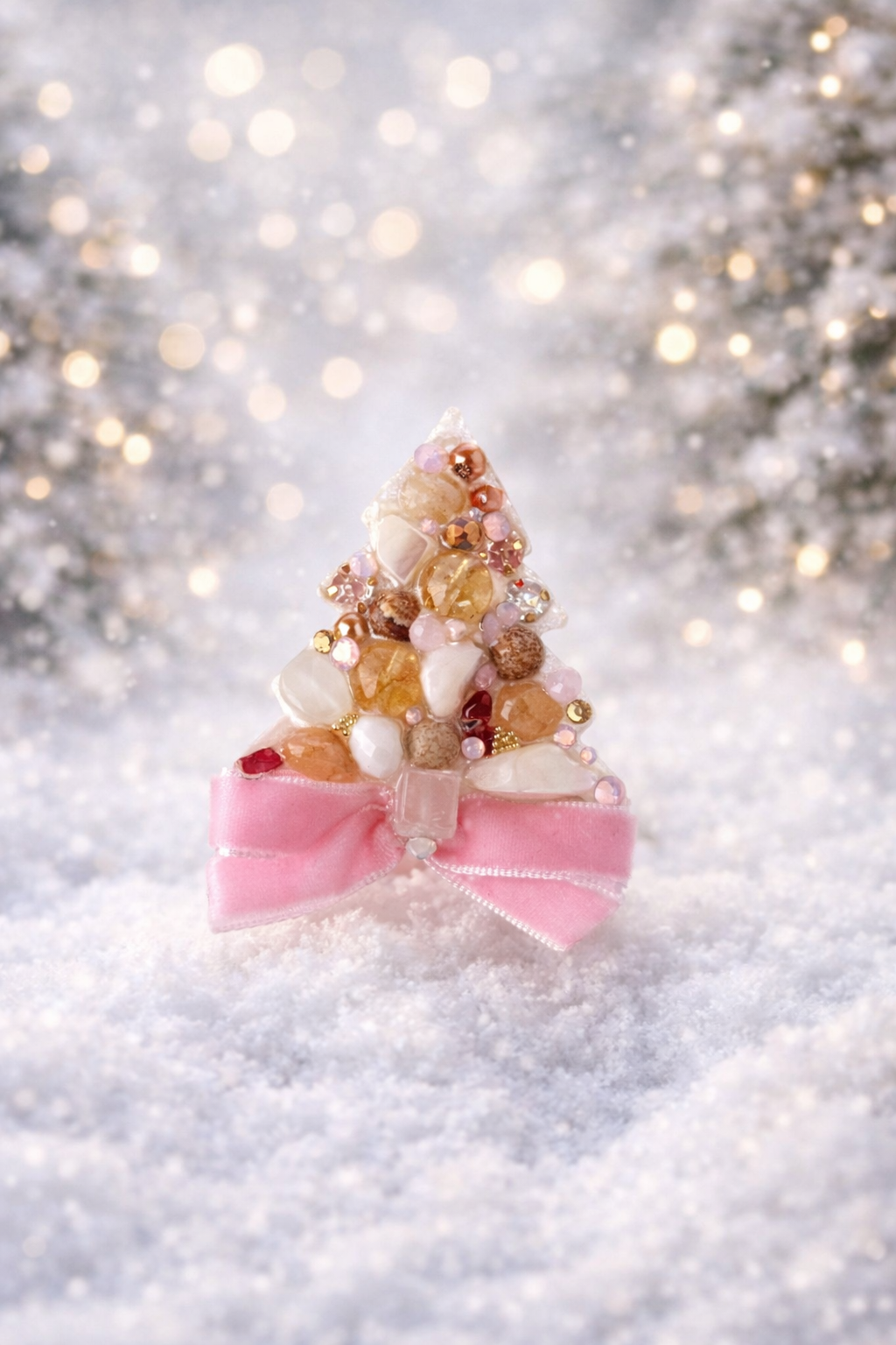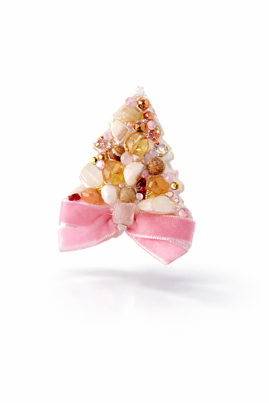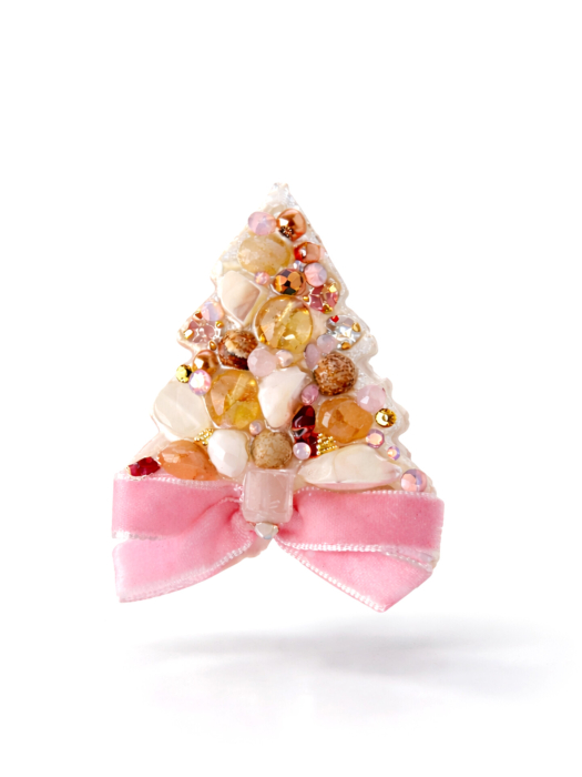 Îmbogățită cu perle, cristale și o fundiță din catifea roz, această broșă transmite o vibrație caldă și elegantă – perfectă pentru sărbători.
