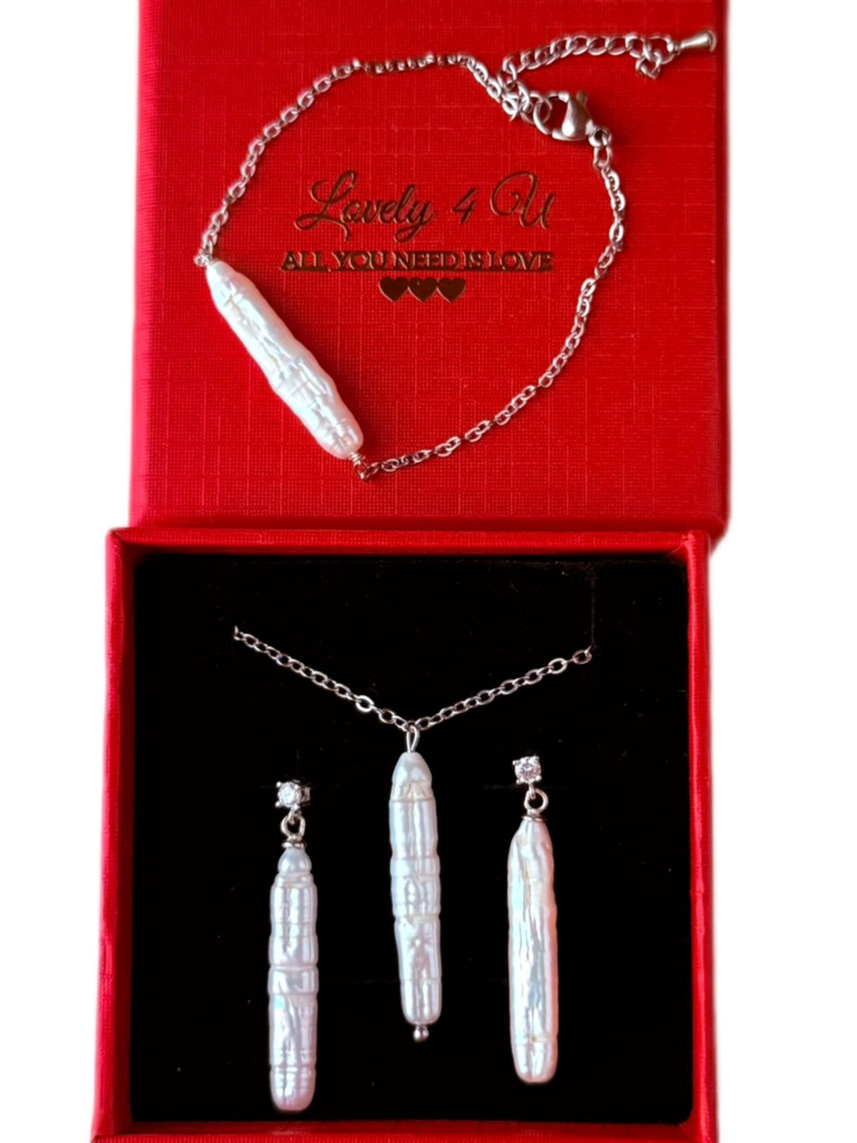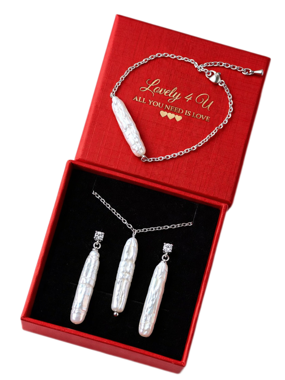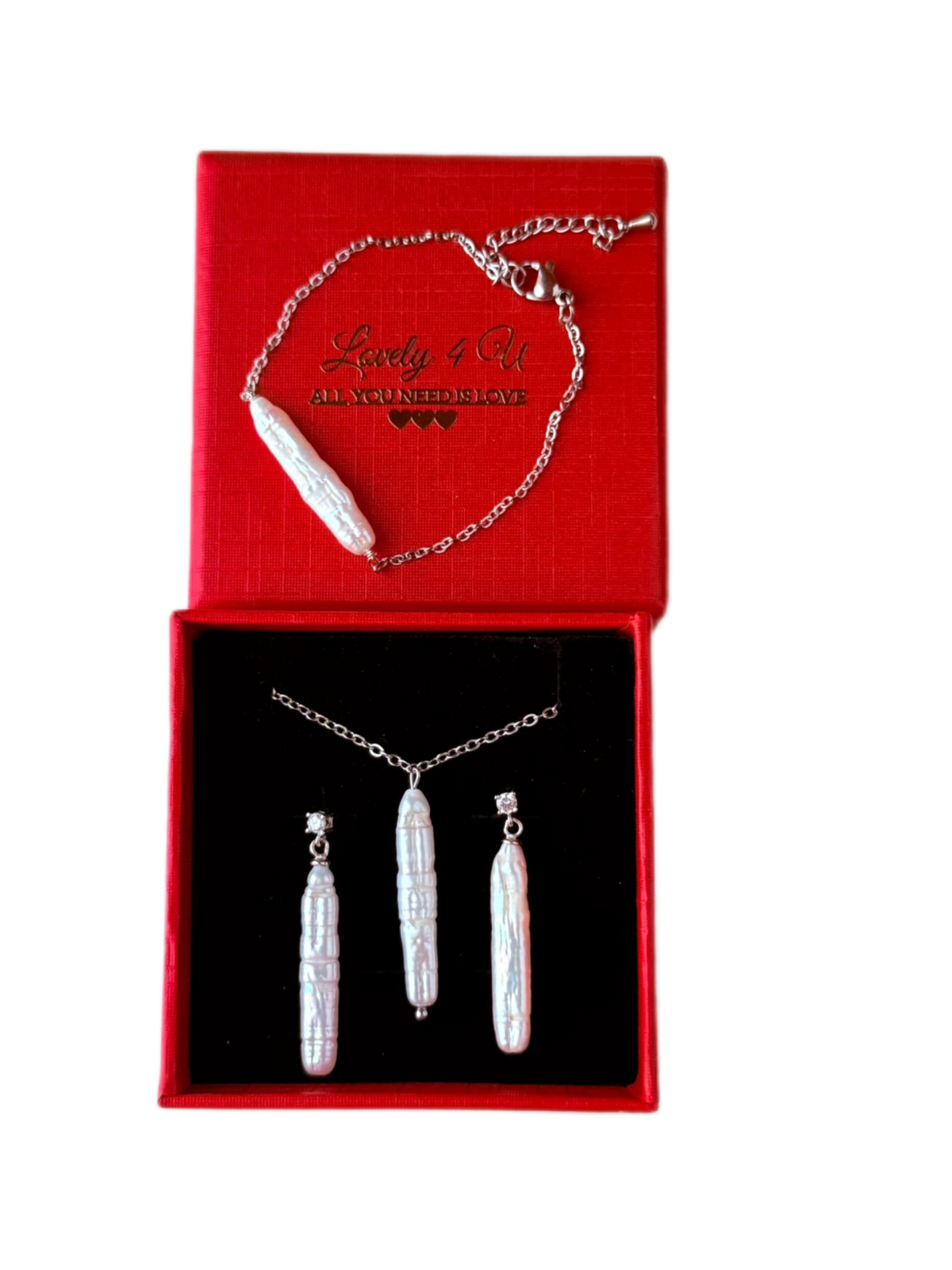 Cerceii, colierul și brățara sunt create pentru a însoți mireasa fără să o eclipseze. Lumina perlelor baroc urmează mișcările tale naturale, iar setul capătă viață odată cu tine – nu este static, nu este rigid, ci firesc și viu.