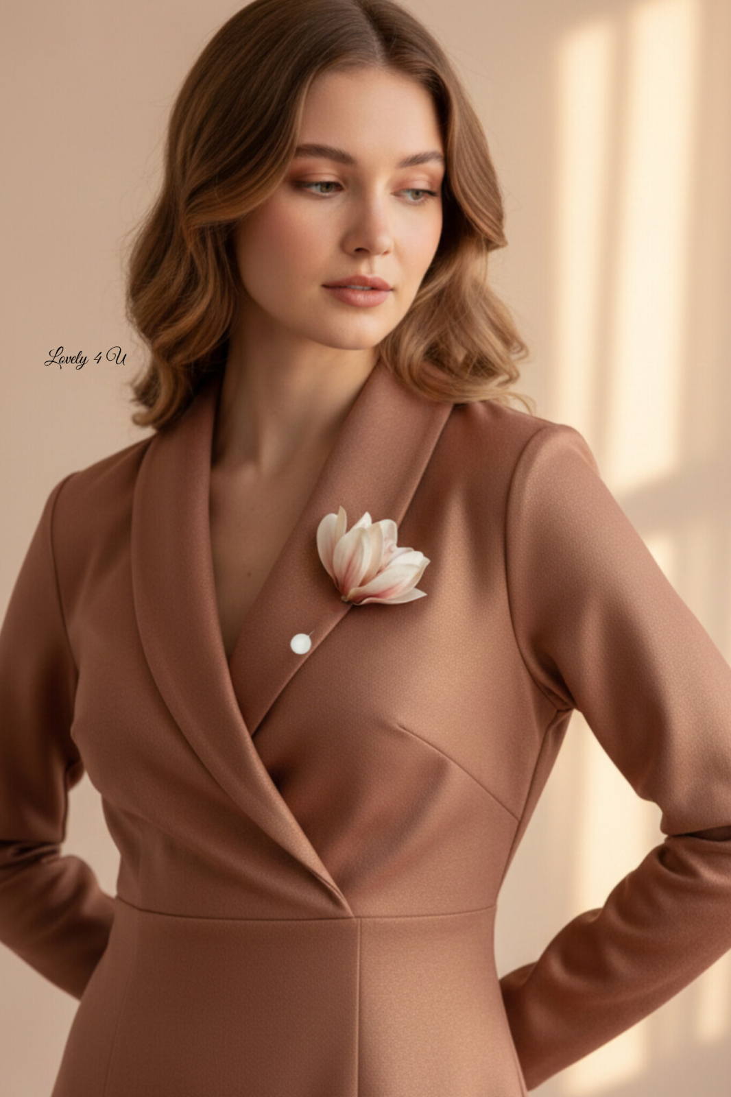 MAGNOLIA GRACE este o broșă statement cu design original LOVELY 4 U, creată manual în România, ca expresie a grației, feminității și forței blânde care se simte, nu se impune. Inspirată din forme botanice universale, această creație are o structură distinctă și o identitate vizuală proprie, recognoscibilă și atemporală.