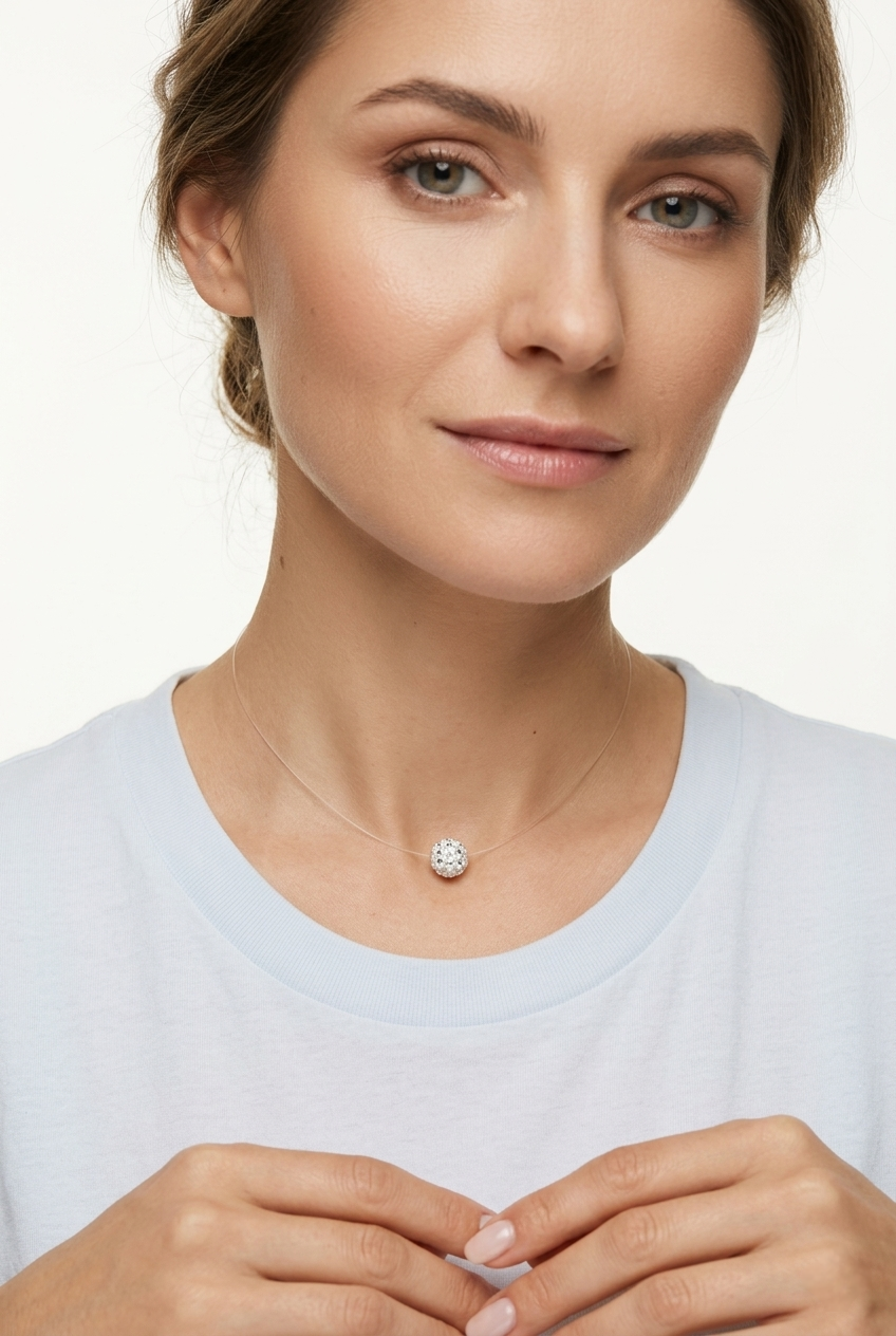 Colier transparent la baza gâtului , colier cu fir transparent / invizibil cu perla SHAMBALLA alba cu pietricele de 10mm, realizat manual in Romania